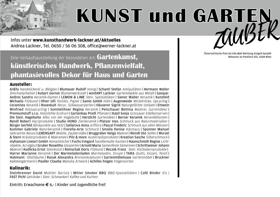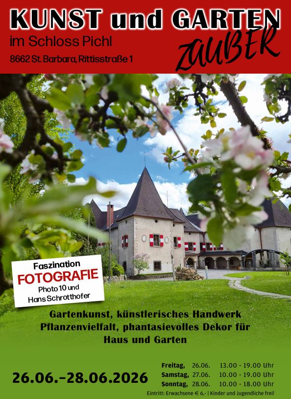 Diese ganz besondere Kunst- und Gartenausstellung am Areal des Schloss Pichl in Sankt Barbara im Mürztal/ Mitterdorf lädt zum Flanieren und Genießen im wunderschönen Gelände des Schlossparks ein. Im Schatten der alten Bäume präsentieren sich kunstvolle naturnahe Kuriositäten – Malereien, einzigartige Kleidungsstücke, Antiquitäten, hochwertige Gartenmöbel, fantasievolles Dekor für Haus und Garten, Naturprodukte, Schmuck, künstlerisches Handwerk aus Keramik, Glas, Stein oder Metall, verschiedene Pflanzen bis hin zur professionellen Gartenberatung.